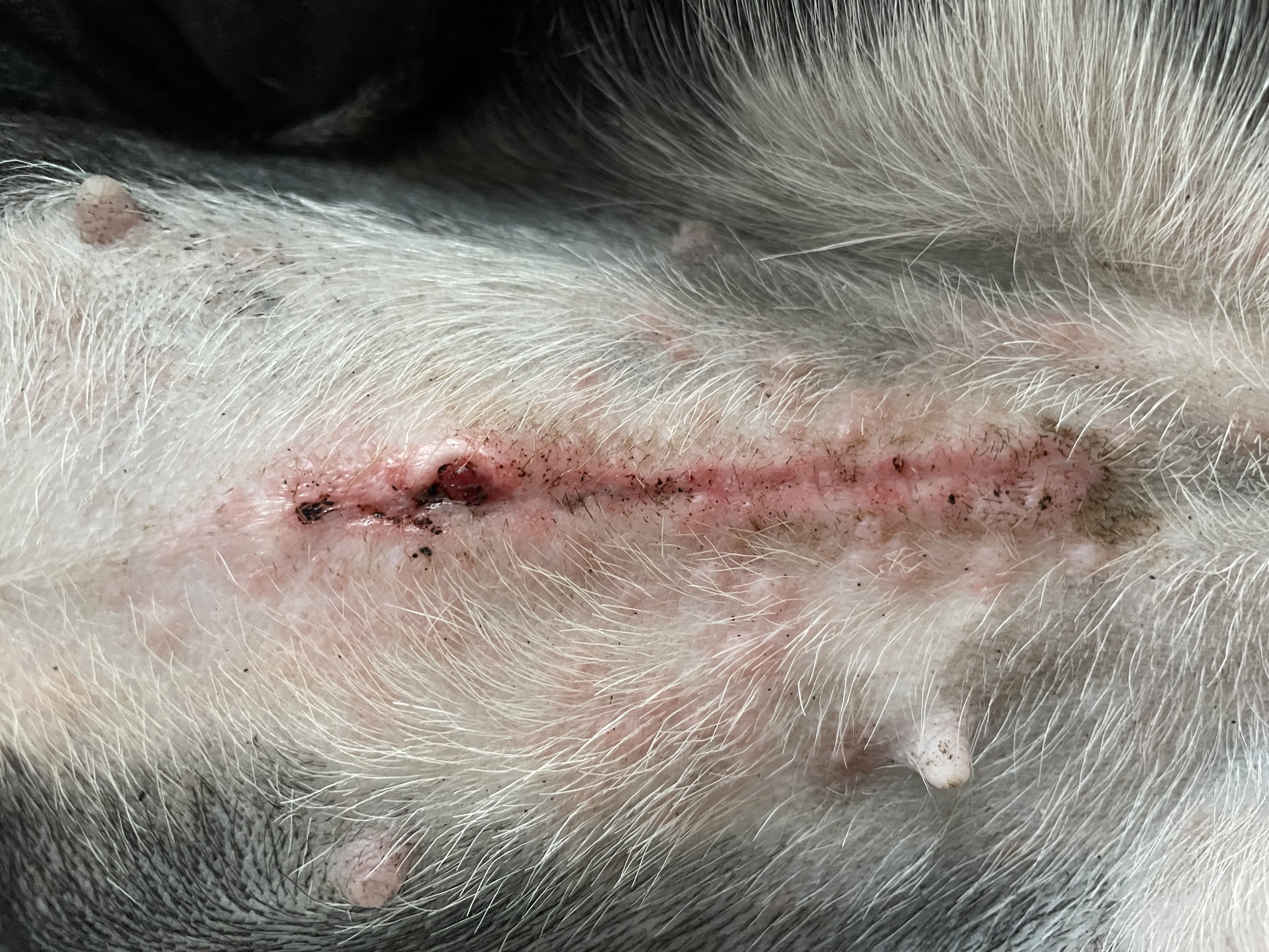 Dobrý den, měla bych dotaz ohledně hojení rány fenky po kastraci. Před týdnem jí vytáhli stehy se zjištěním, že v horní části došlo k poškození rány a špatnému hojení. Bylo nám doporučeno jizvu potírat hypermanganem a vzniklé stroupky čistit peroxidem. Posledních pár dní se objevují po celém břiše kolem rány červené pupínky (viz. fotografie) a problémová část jizvy je vždy trochu od krve při otíraní. Dnes i po natření hypermanganem byla tato oblast lehce mokrá a nechtěla úplně zaschnout. Jinak se rána vcelku dobře hojí. Chtěla bych se zeptat, jestli je tohle všechno v pořádku, nebo se může jednat o něco závažnějšího. Děkuji za odpověď.