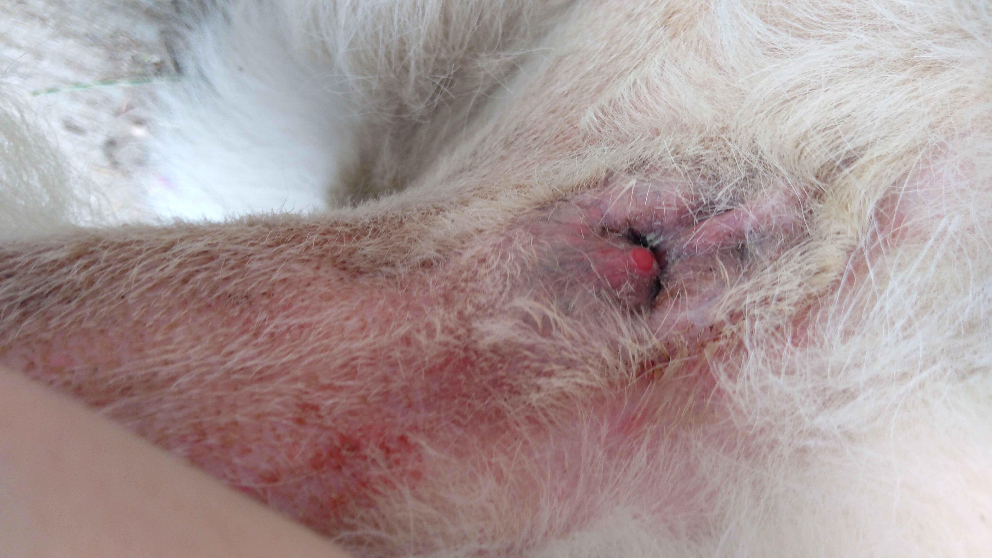 Dobrý den, pes (sl. čuvač, 5 let, kastrovaná fena) je alergik (roztoči) a každé léto ho trápí svědění a zarudlost kůže. Nyní ho to trápí též, začervenání se letos usadilo na ocasu. Všimla jsem si, že má na řitním otvoru jaoby vyhřezlí tmavě červený hladký útvar, kterého jsem si dříve nevšimla. Mohla si to poškodit např. zubem, když si kousala právě okolí ocasu? Přikládám foto. Je to nutné na návštěvu veteriny nebo můžeme něco udělat doma?