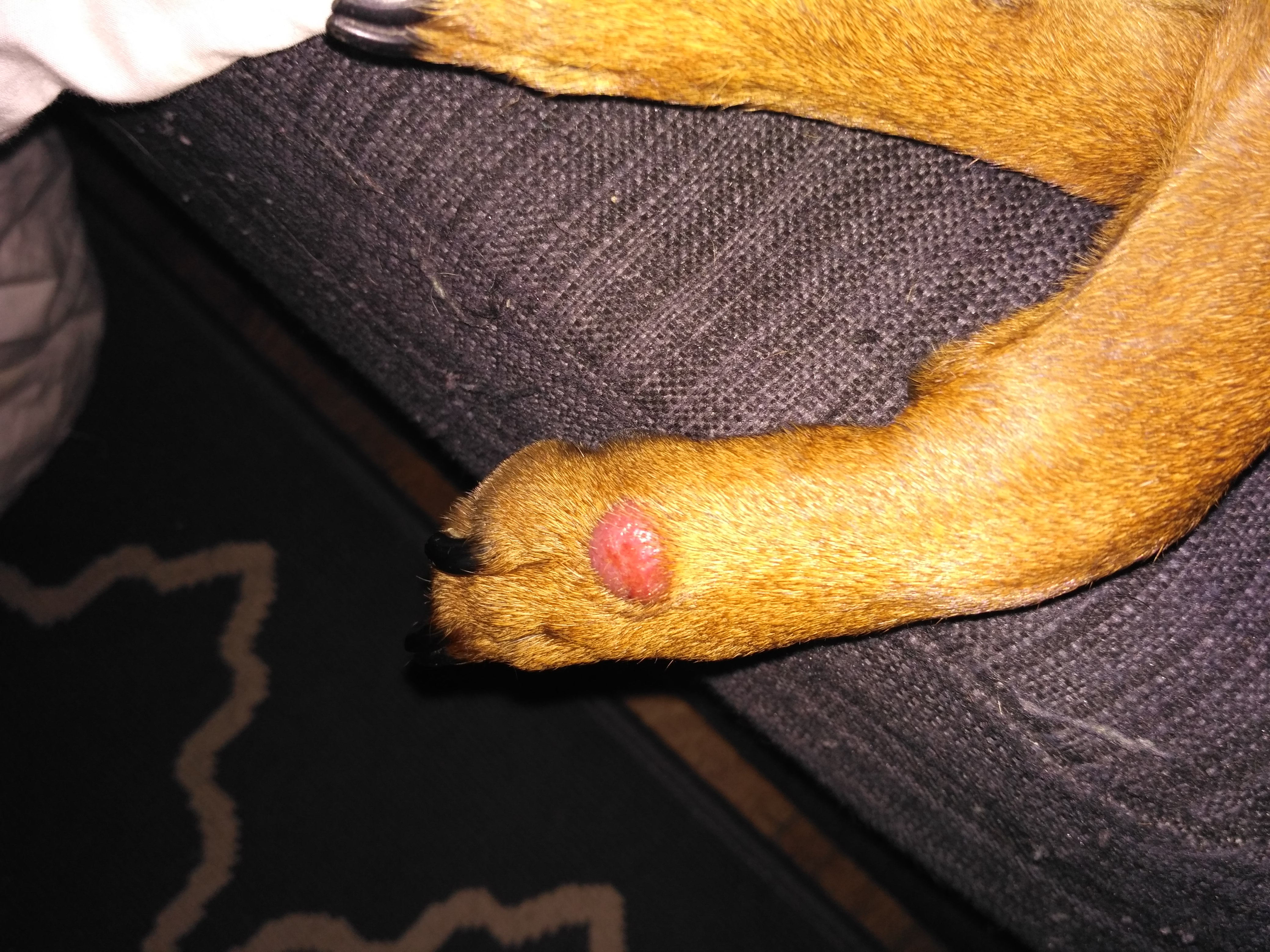 Dobrý den. Před pár dny se mému pejskovi na tlapce objevila růžová tvrdá boule. Nevím co to je, a proto dokládám fotku. Předem děkuji za vaši rady, ale chci vědět jestli mám okamžitě zamířit za veterinářem.
