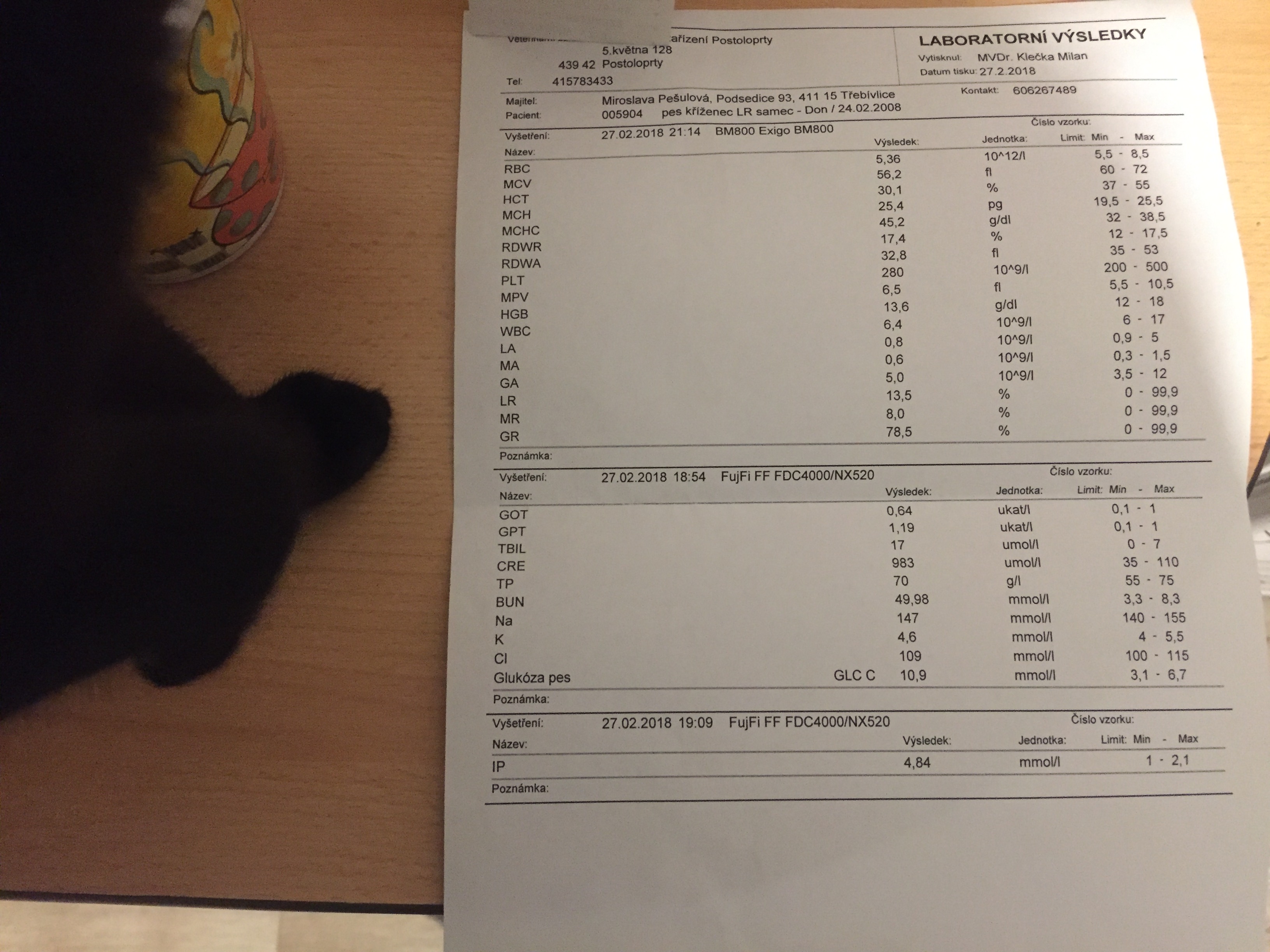 Dobrý den, výsledky krve nejsou z fotografie moc čitelné, poprosím,abyste mi je zaslala do mejlu - info@veterinakadan.cz spolu s informacemi, jakou vám stanovili diagnózu co máte nasazené/doporučené jako léčbu.