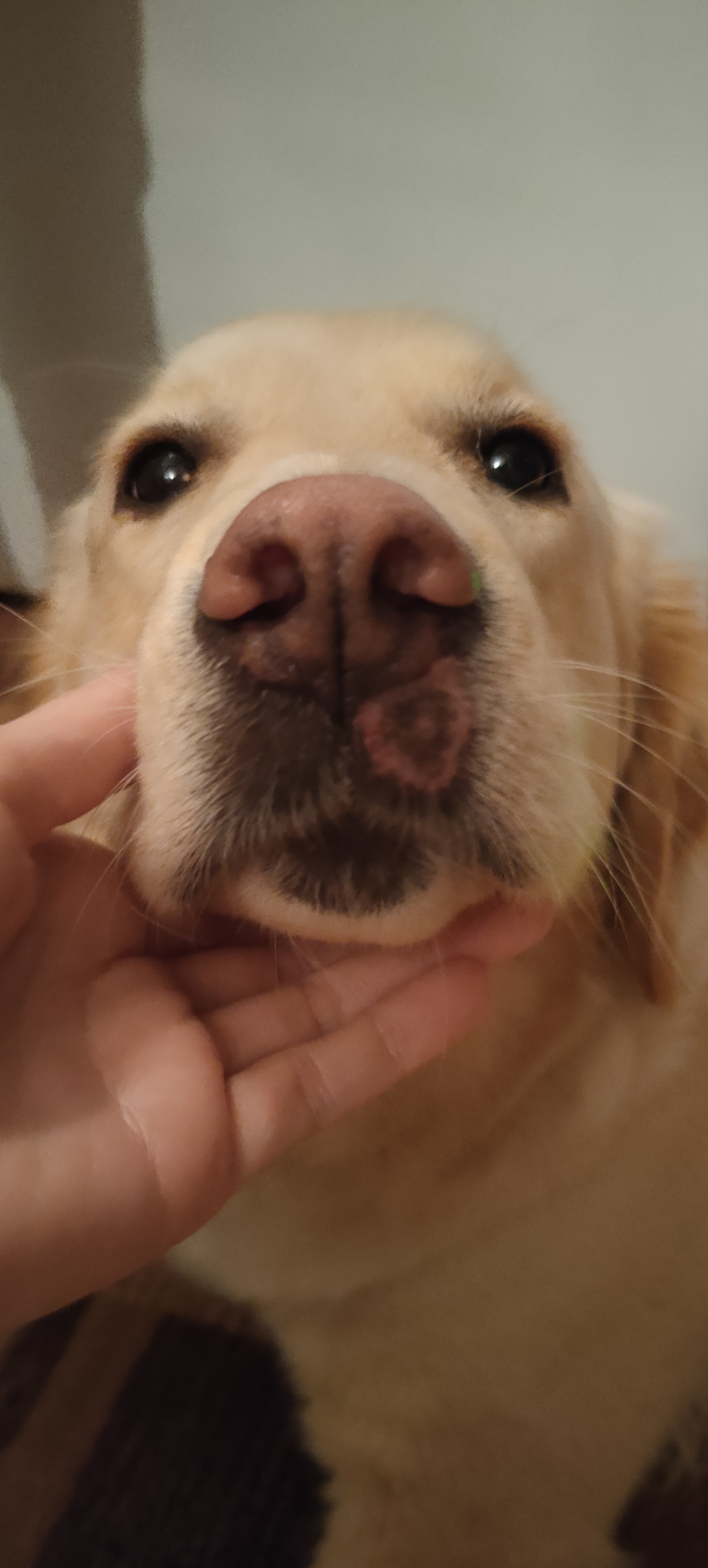 Dobrý večer, mám dvou roční fenku zlatého retrívra, nyní jsem si všimla, že se jí udělala velká, ohraničená skvrna hned u nosu. Viz foto. Co to může být? Hned zítra se pokusím o veterinární pohotovost nebo v nejbližších dnech, kdy bude k dispozici. Děkuji. Škodová