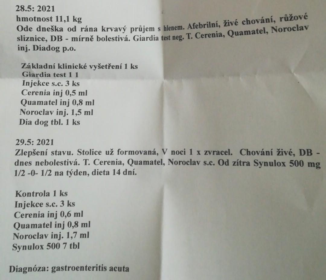 Dobrý den. Ráda bych se Vás zeptala, zda je v pořádku, že mi 11 t štěně NO při dietě nepribira. Má stále 11 kg. Dietu máme vařená kuřecí prsa s rýži (1/3 - 2/3, cca 5-6 porci za den, cca 100 - 120 g rýže - vařím tu pytlikovou). Začínám už trochu plašit, tak se chci radši optat ještě jinde. Diagnóza viz foto.