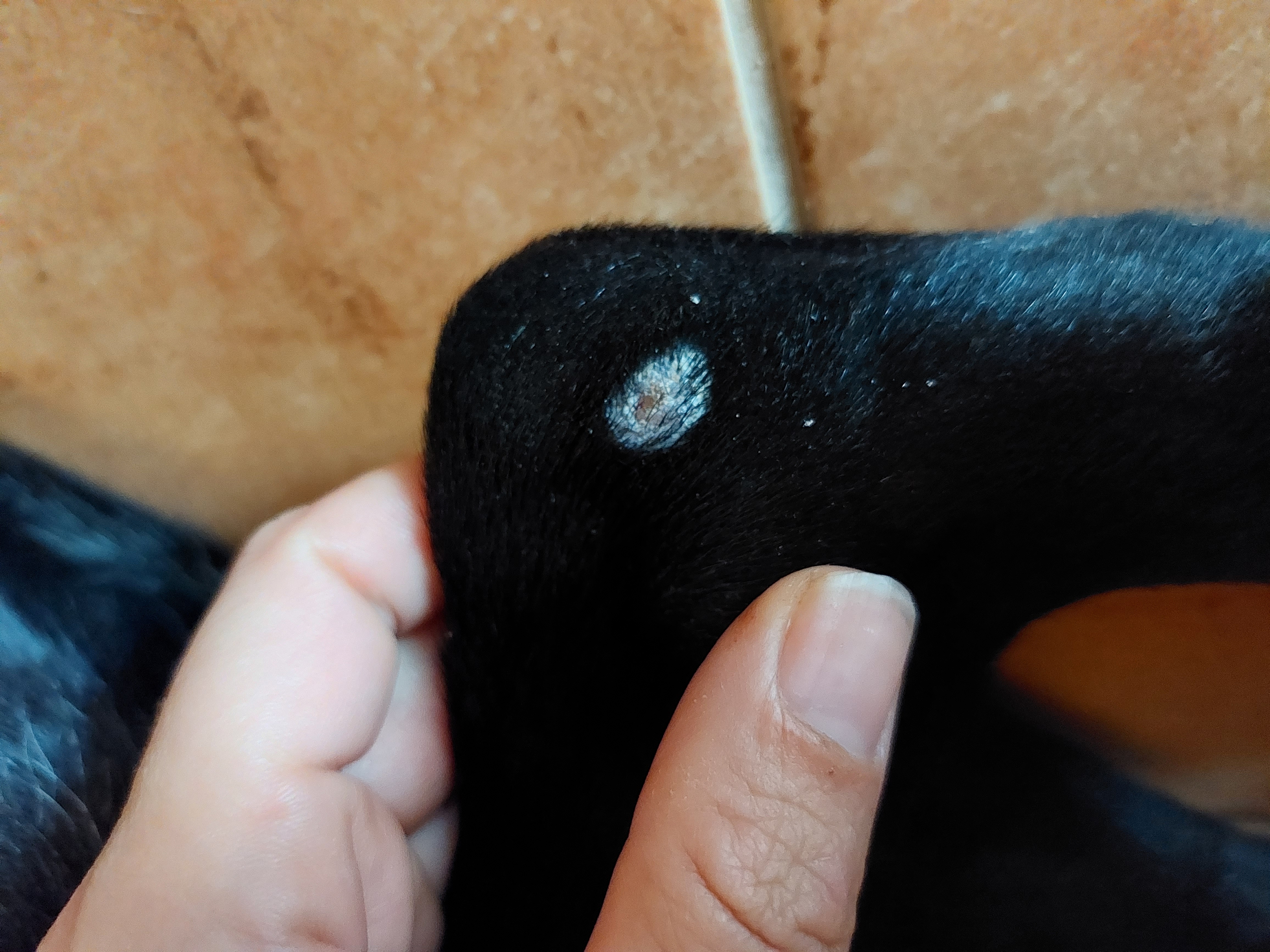 Dobrý den. Mám 7 měsíční fenku a všimla jsem si, že na noze se jí udělal jakýsi strup. Nijak to nekouse ani ji to nesvedi. Ale trochu se to zvětšilo. Nevíte, co to může být?
