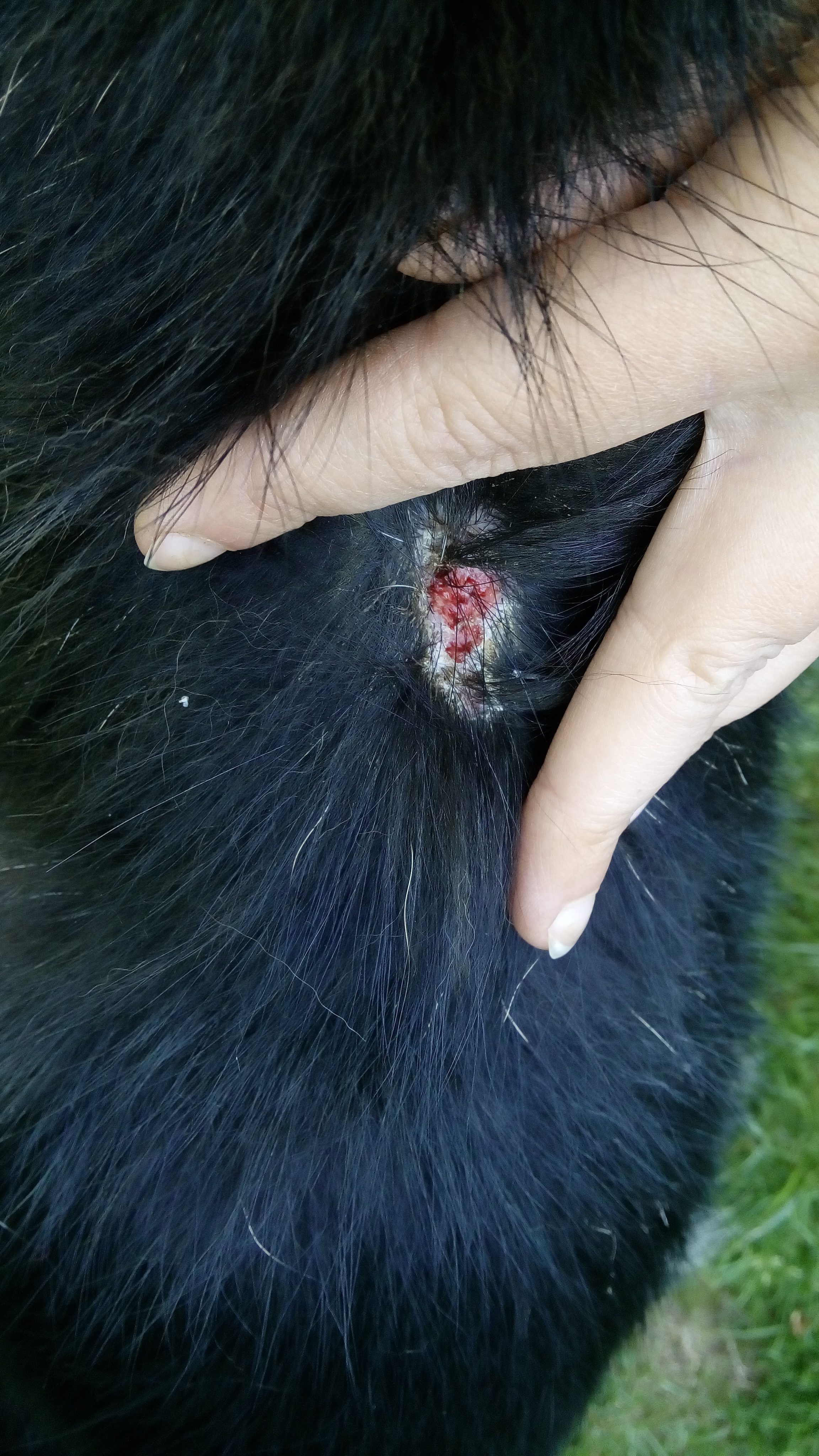 Dobrý den, Bohužel dle fotky nejde nikdy poznat příčina kožních problému. Důležité já jestli si to drbe nebo ne, jestli se objevují další....pokud to ani nedrbe a ani se neobjevují další, mohlo by to být mechanickým poškozením kůže a tím pádem by se to mělo zhojit samo. Můžete to ošetřovat desinfekci Betadine a nestrhávat strupy nasucho (rozmočit a kdyžtak sundat co půjde). Na tu bázlivost bychom doporučili zakoupit zklidňování obojek na bázi feromonů aby si na tu velkou změnu snadněji zvykla. Hodně stesti