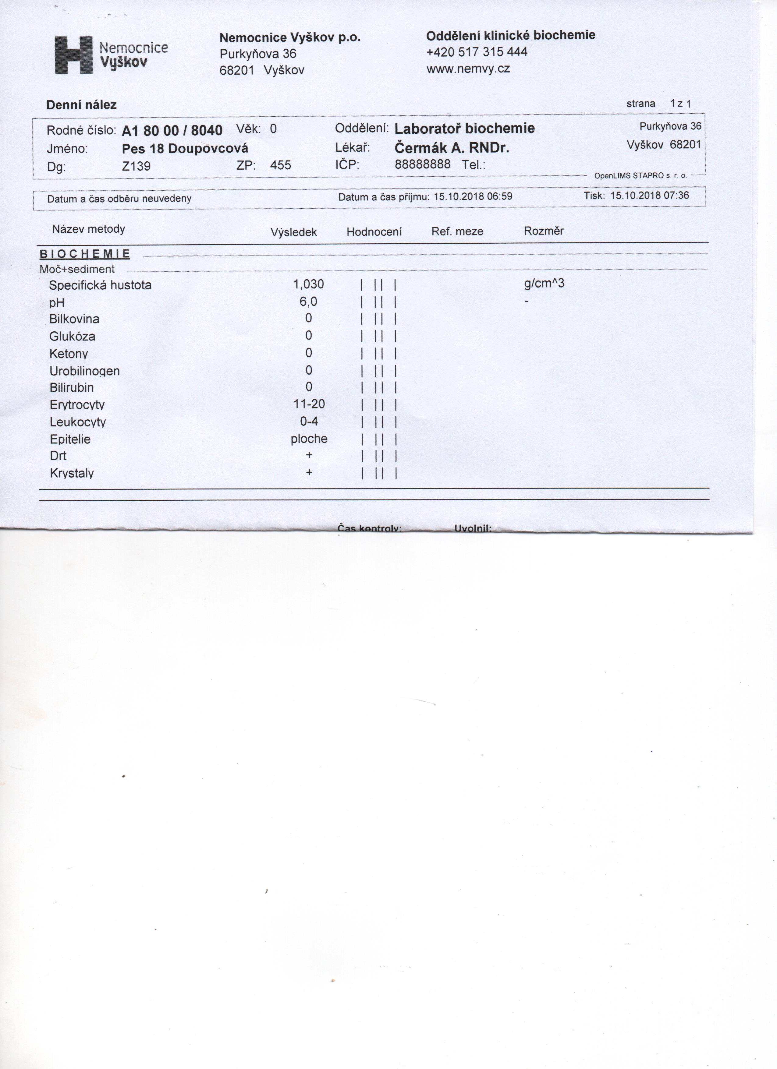 Dobrý den,mám jorkšíra 5,5 roku,do ted vše v naprostém pořádku,začátkem září dostal křece a třes,u našeho veterináře se zjistilo na sonu urolit 5mm,který se musí jiz chirurgicky vyjmout 21.9, museli ho i katetrizovat a proplachovat,mel hodne pisku v mocových cestách, po rozboru slo o urolit štavelanu,po vytažení stehu mu delali závěrecné sono,kde zjistili 3mm nános písku,jsou specialni URINAL granule pro psi,ale pry to na stravu nevypadá 14 dni po operaci,granule mi také nikdy nejedl ,ma denne vařenou rýži,kousíček vař.mrkvičky,kurecí maso,srdicka,kuř.jatýrka ci rybu s přídavkem lososového oleje. závěr.: mam mu do stravy pridávat špetku sody bikarbony a 1/4 pyridoxinu.....Pracuji v lékárně,tak si nechávam co týden delat moč....stále je tam drt,epitelie,erytrocyty a v dnešním jiz krystaly,vysledek posilam v příloze.... nemohou mu nějak tohle produkovat zvýšeně ledviny i to překyselení , pořád ho to také nutí močit i když jen zdvihne nožku,co mi poradite ...děkuji moc za váš čas a odpověd s pozdravem Doupovcová nejak prostřídávám.....