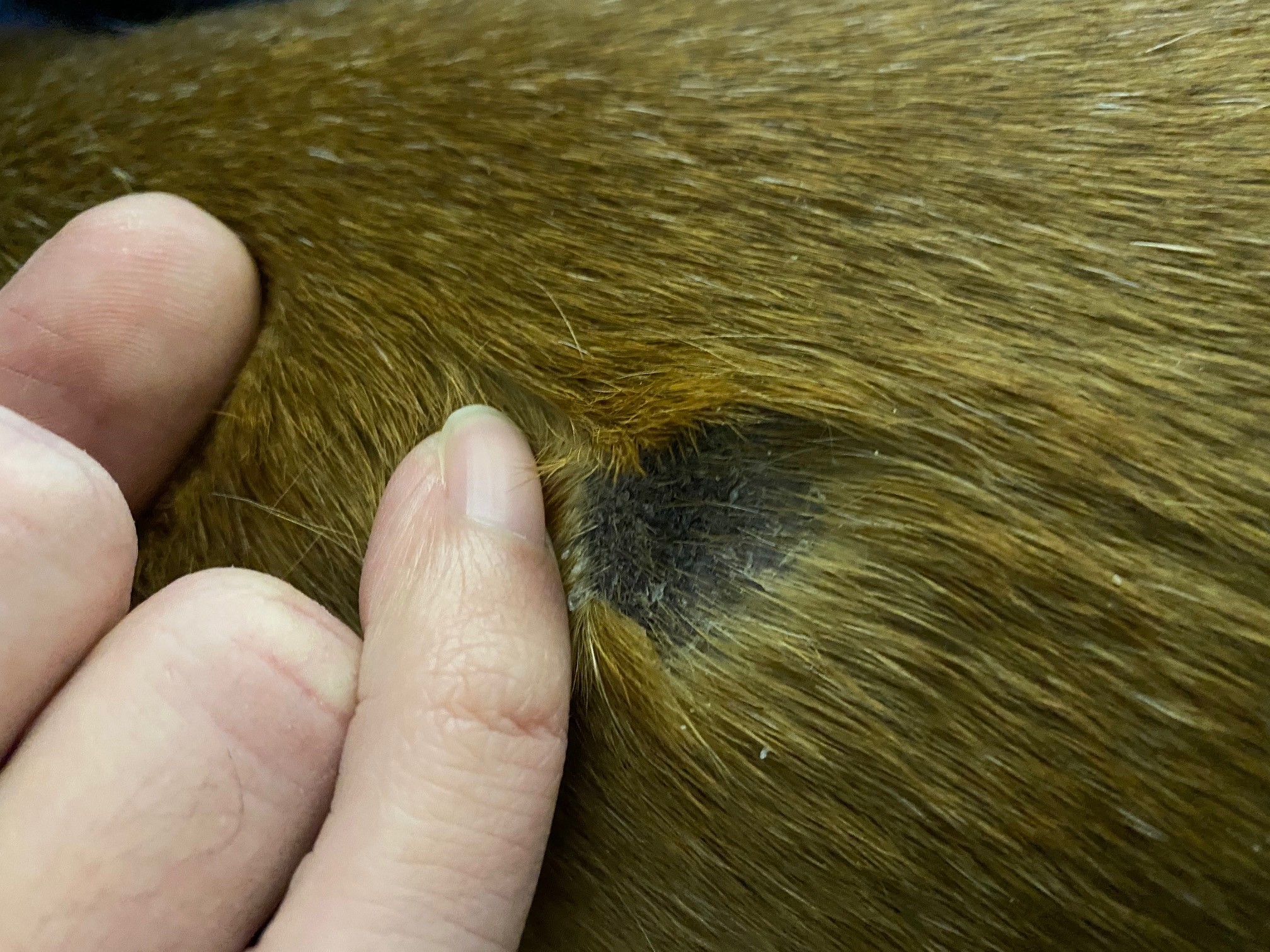Dobrý den, ráda bych se poradila ohledně tmavého fleku s rohovitou strukturou v srsti naší 13 leté fenky německého boxera. Dnes jsme na to narazili, protože jí náhle z místa v celých trsech vypadla srst. Foto přikládám. Děkuji moc za radu.