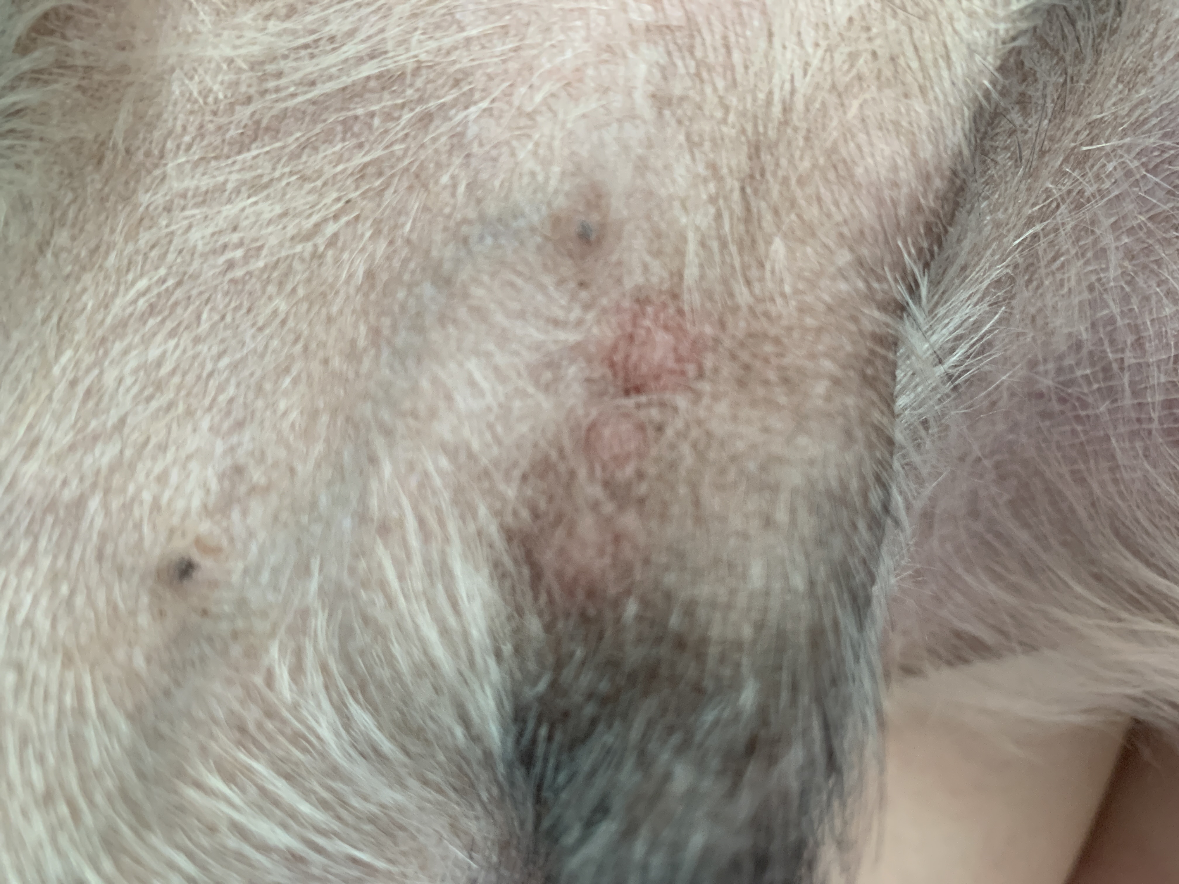 Dobrý den, od včerejška si můj pejsek oblizuje oblast okolo genitálií. Břicho a zadní vnitřní část nohou měl trochu od bláta, tak jsem ho umyla a více neřešila v domnění, že to byl ten problém. Do dnešní večerní procházky tam nic neměl, ale po umývání vlhkým hadříkem jsem zjistila tři takové pupínky. Občas si to místo líže, takže ho asi občas svědí. Jinak je v normálním stavu. Běhá, jí, pije a vylučuje úplně bez problémů a je jako by mu nic nebylo, kromě toho oliziváni. Mohla bych poprosit o radu?