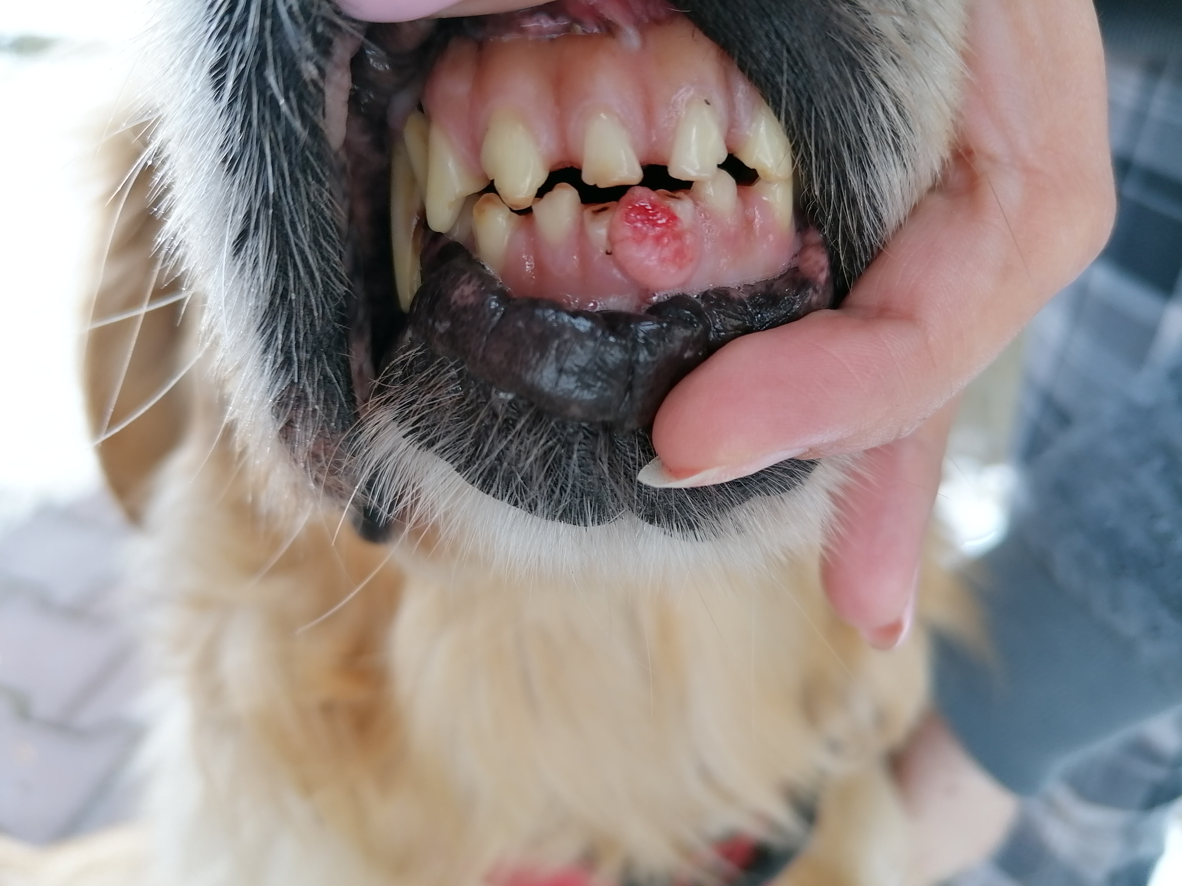 Dobrý den, máme 7 letou fenu zlatého retrívra. Dnes jsem si všimla výrustku na dásni mezi spodními předními zuby (viz foto). Na omak tvrdý, aktivně nekrvácí, evidentně nebolí. Fena žere normálně (granule Calibra nebo Brit), bez problému kouše klacky nebo kosti. Nepozoruji změnu chování. Poradíte mi, prosim, o co může jit? Děkuji Pažoutová