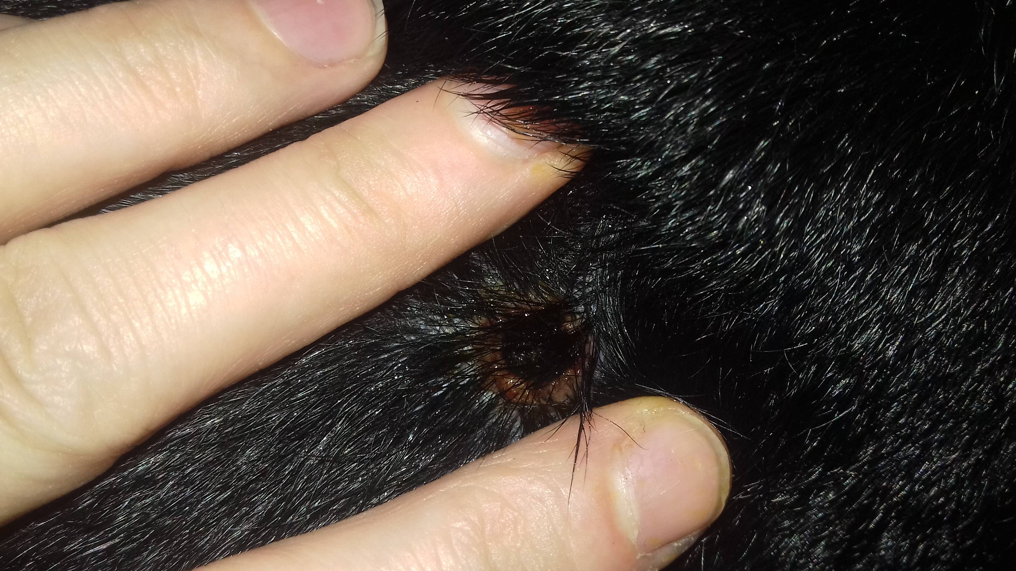 Dobrý den, asi před měsícem začalo našeho jezevčíka svědit misto na zádech ,po cca dvou týdnech se objevil tento výrůstek, po mazání bepanthenem se dosti zmenšil, ale ted už zůstává ve stejném tvaru,výrůstek se olupuje, Černy strup uprostřed je velmi tvrdy,z celého vyrostku vyrůstají chlupy.pes má dva roky,zadne jiném příznaky nemá, Prosím o co by se mohlo jednat?na veterinu jdeme koncem týdne.