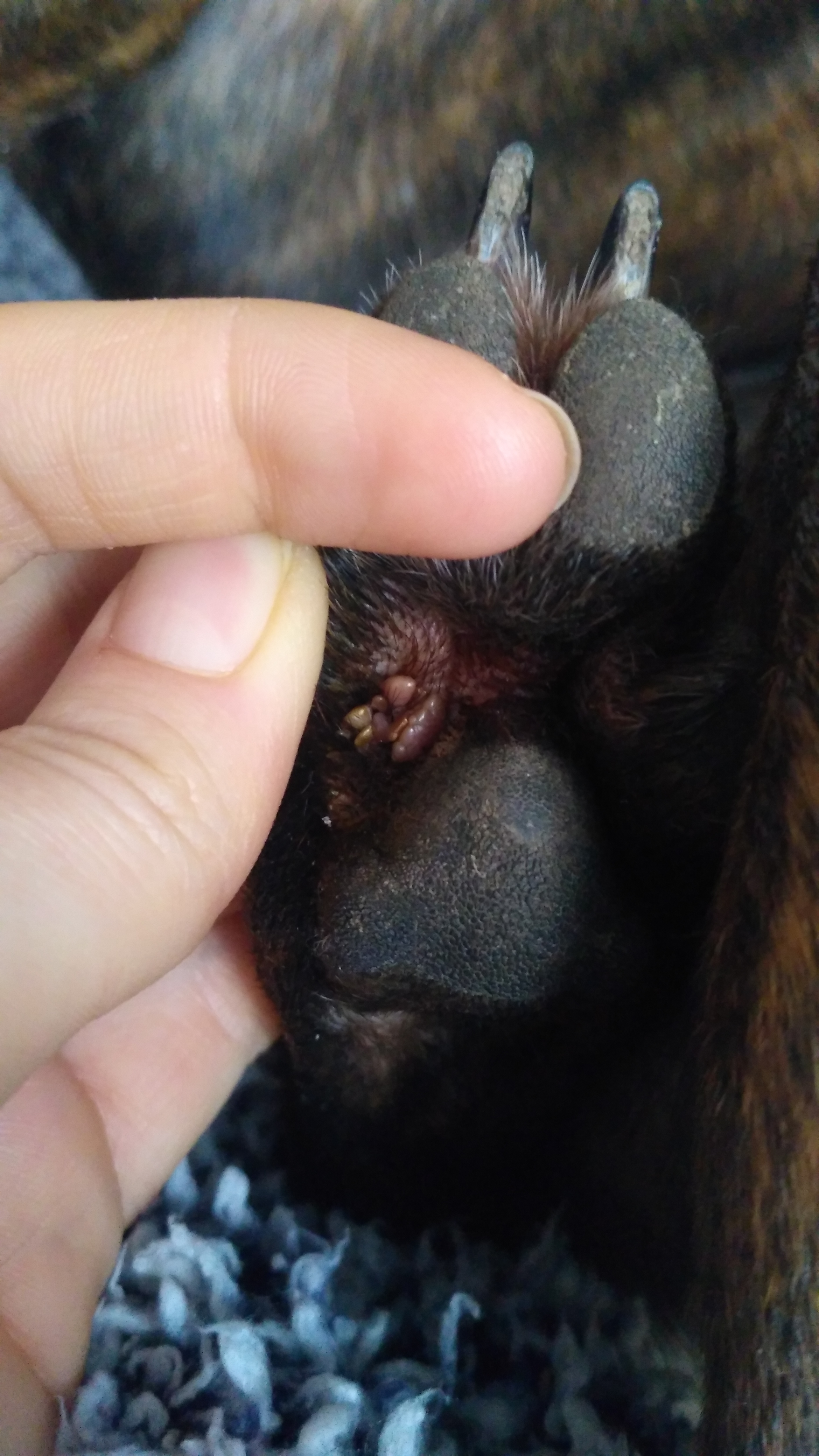 Dobrý den, naše fenka má už několik týdnů na pacce takové výrustky-viz.přiložená fotka. Na veterině jsme byli, dali nám na potírání nějakou jodovou tinkturu a že když to nezmizí, tak jedině operačně vyříznout. Nicméně jsem vubec nepochopila, co to je, jestli je to pro psa nějak nebezpečné, nebo co to způsobuje.. evidentně ji to vadí, protože má tendence si tu packu kousat, aby to dostala ven. Moc děkuji za odpověď :)