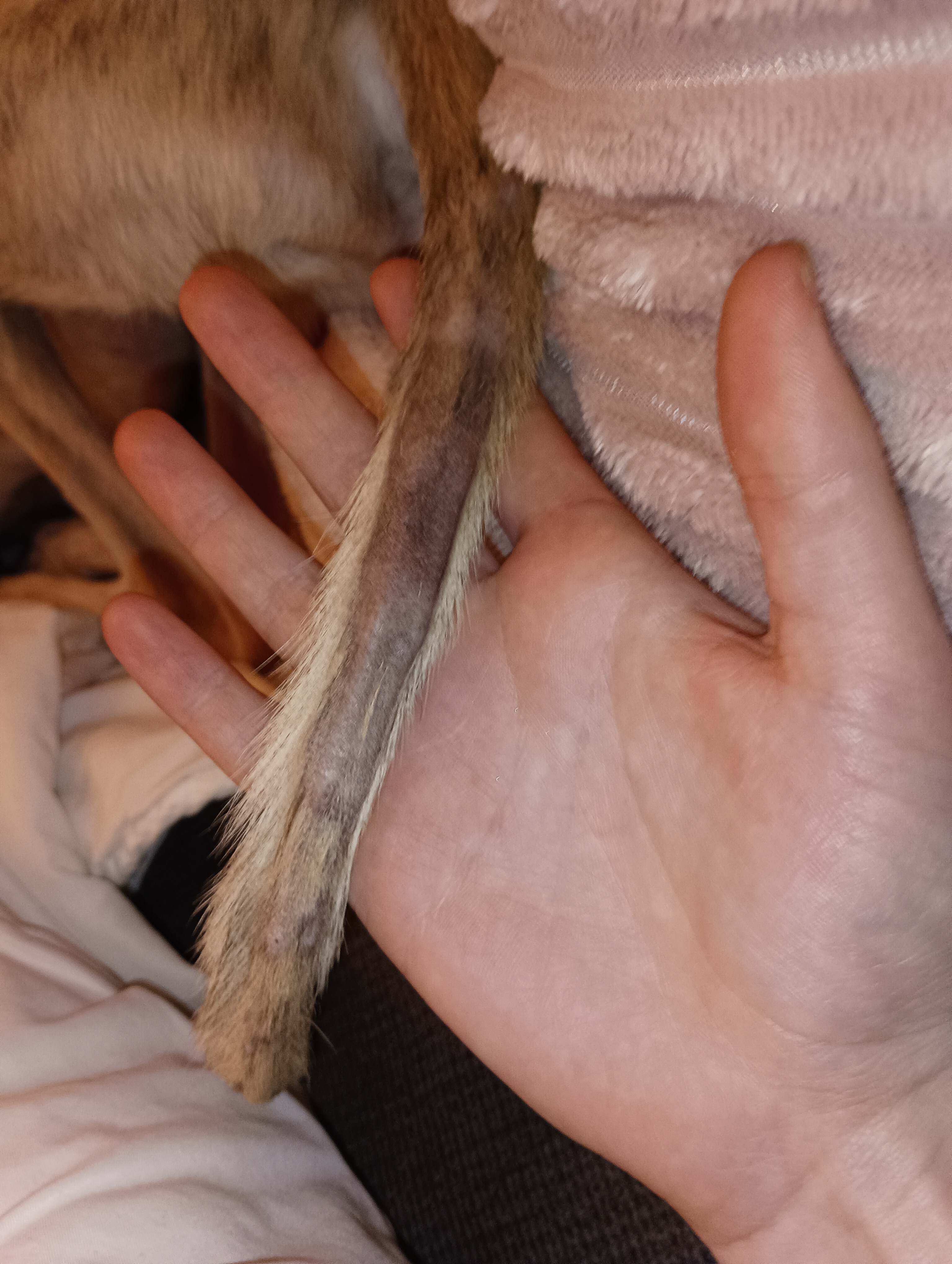 Dobrý den, máme 2 letého Whippeta. Již delší dobu u něj řešíme neskutečnou chuť k jídlu a i přesto neschopnost nabrat tukovou a svalovou hmotu... Je jako chodící kostřička i když mu chutná a tráví bez zjevných problémů. U veterináře vyšly krevní testy v naprostém pořádku, v podstatě nás odmávli s tím, že je prostě takový. Zkoušeli jsme několikrát změnit granule, ovšem bez výsledku. K tomu všemu se přidalo vypadávání srsti specificky na ocase viz. foto. Ač místo na srsti není zarudlé či nějak suché nebo drážděné, přijde nám to zvláštní. V menší míře je u chrtů vypadávání srsti na ocase normální, prý je tam pachová žláza. Ale toto je opravdu hodně a již to tak má delší dobu. Co to může být? Děkuji
