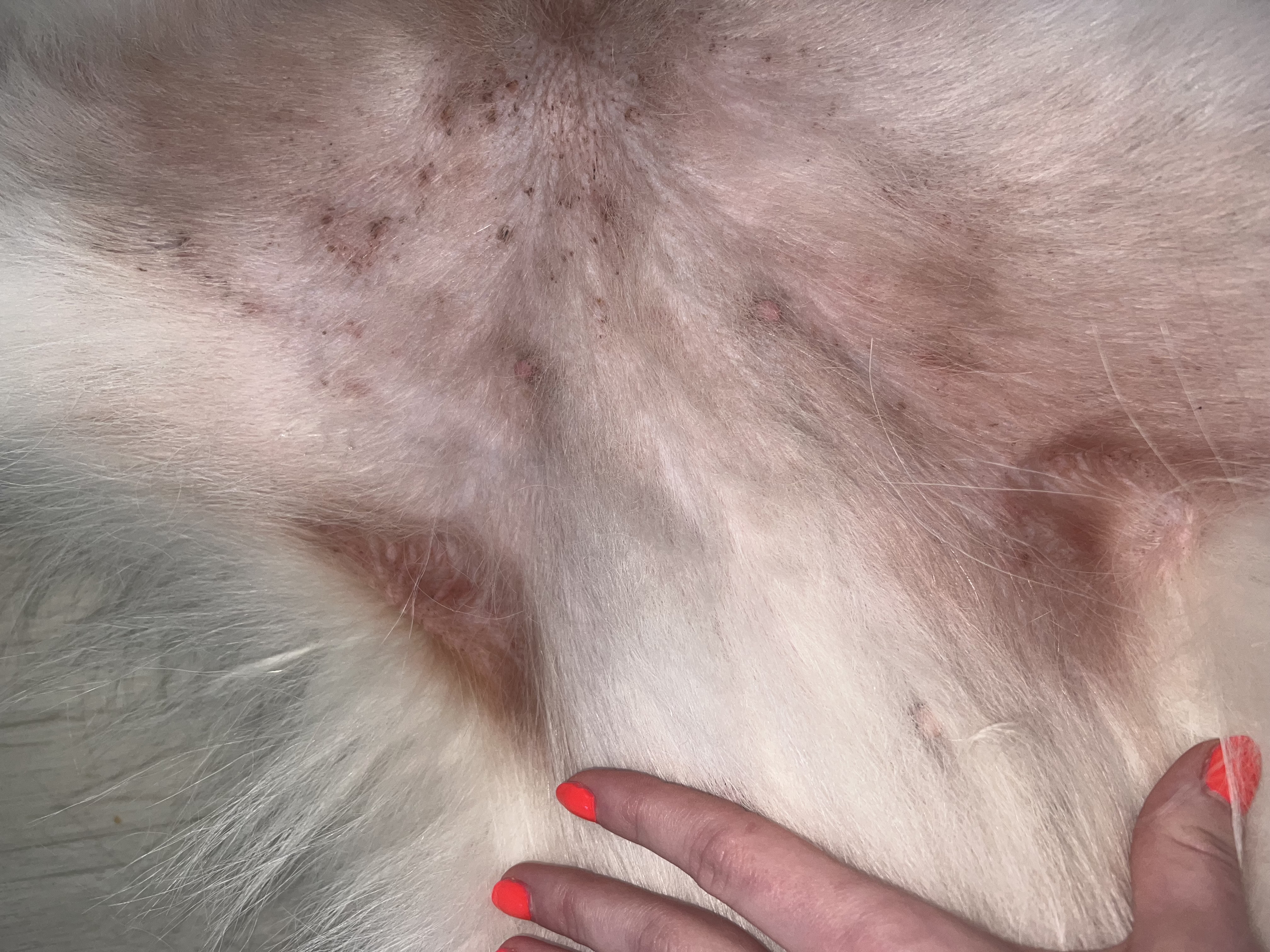 Dobrý den, mám tříletou fenku Samojeda a takto se jí zbarvila kůže (viz. fotka). Má tam malé růžové flíčky. Ty černé tečky nejsou blechy ani klíšťata, je to maz v chlupovém váčku. Nezměnili jsme krmivo, nedrbe se a nevypadá že by ji něco trápilo, je stejně akční jako vždy. Může jít o alergii nebo něco takového? Lze to vyléčit svépomocí nebo bude nutná návštěva veta? Děkuji :)
