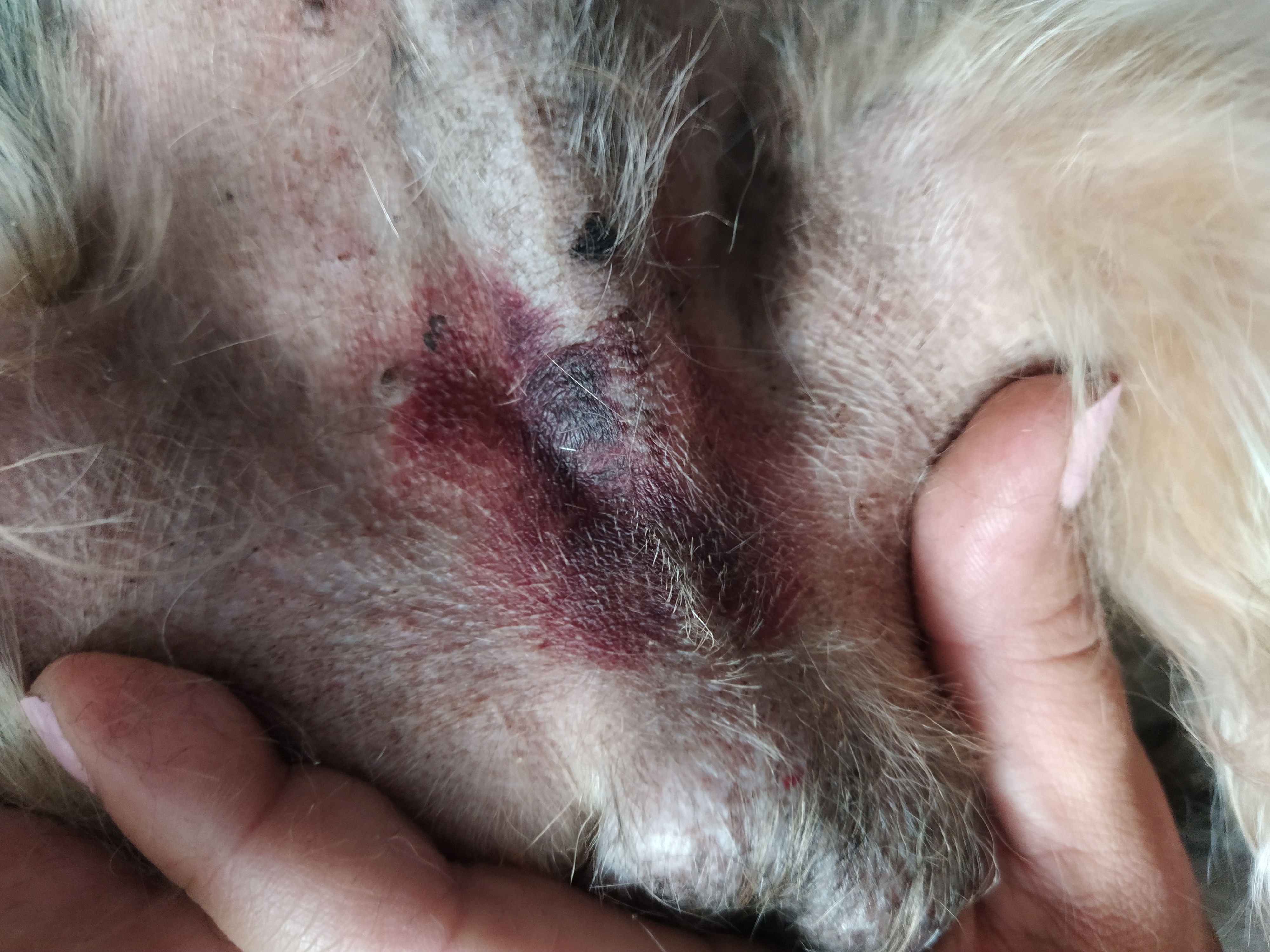 Dobrý den, z fotografie to spíše připomíná hematom (modřinu). Váš pejsek se nejspíše někde uhodil, každopádně to sledujte a pokud by se to mělo tendenci šířit, nebo vykazoval pejsek další klinické příznaky (bolest, svědění,...), tak navštivte veterinárního lékaře. S pozdravem MVDr. Vaisová Petra