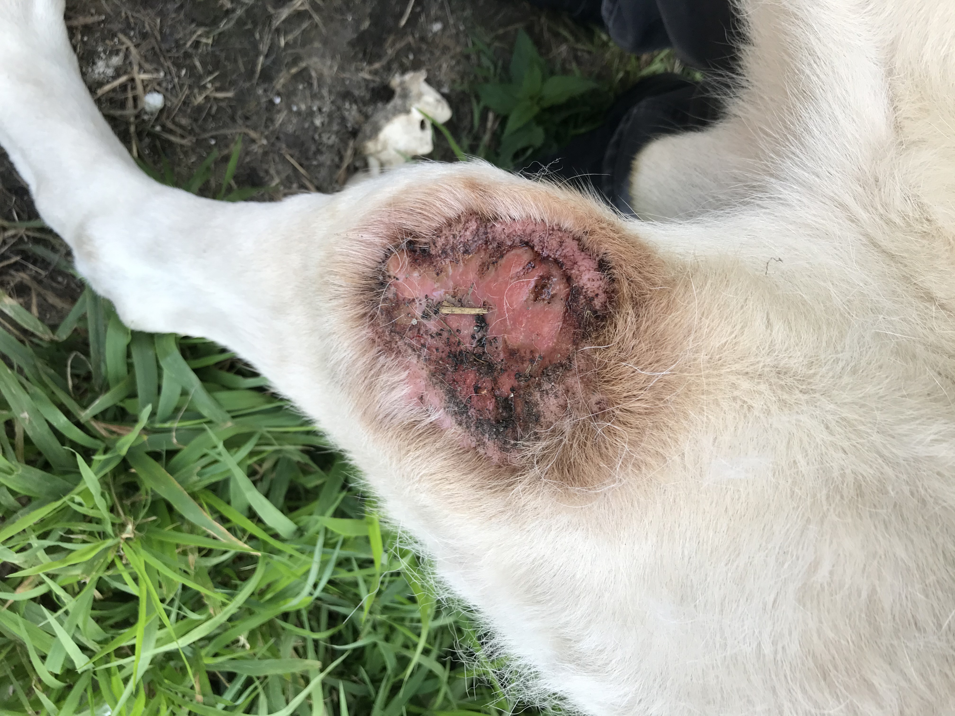 Pes stari asi 11 let vykousava si diru na noze viz foto Jedna se o psa sousedky nestara se o nej 24hodin denne zavreny v kotci co s tim