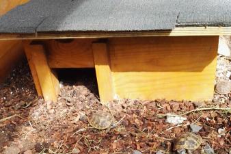 Želva ke spokojenému životu vyžaduje dostatečně chladné a stinné místo. Ideálně domeček z hrubého kusu dřeva zajistí skvělou izolaci a tedy ochranu před přílišným horkem. Stejně dobře mohou posloužit i kořen stomu nebo velký kus rozbitého květináče.