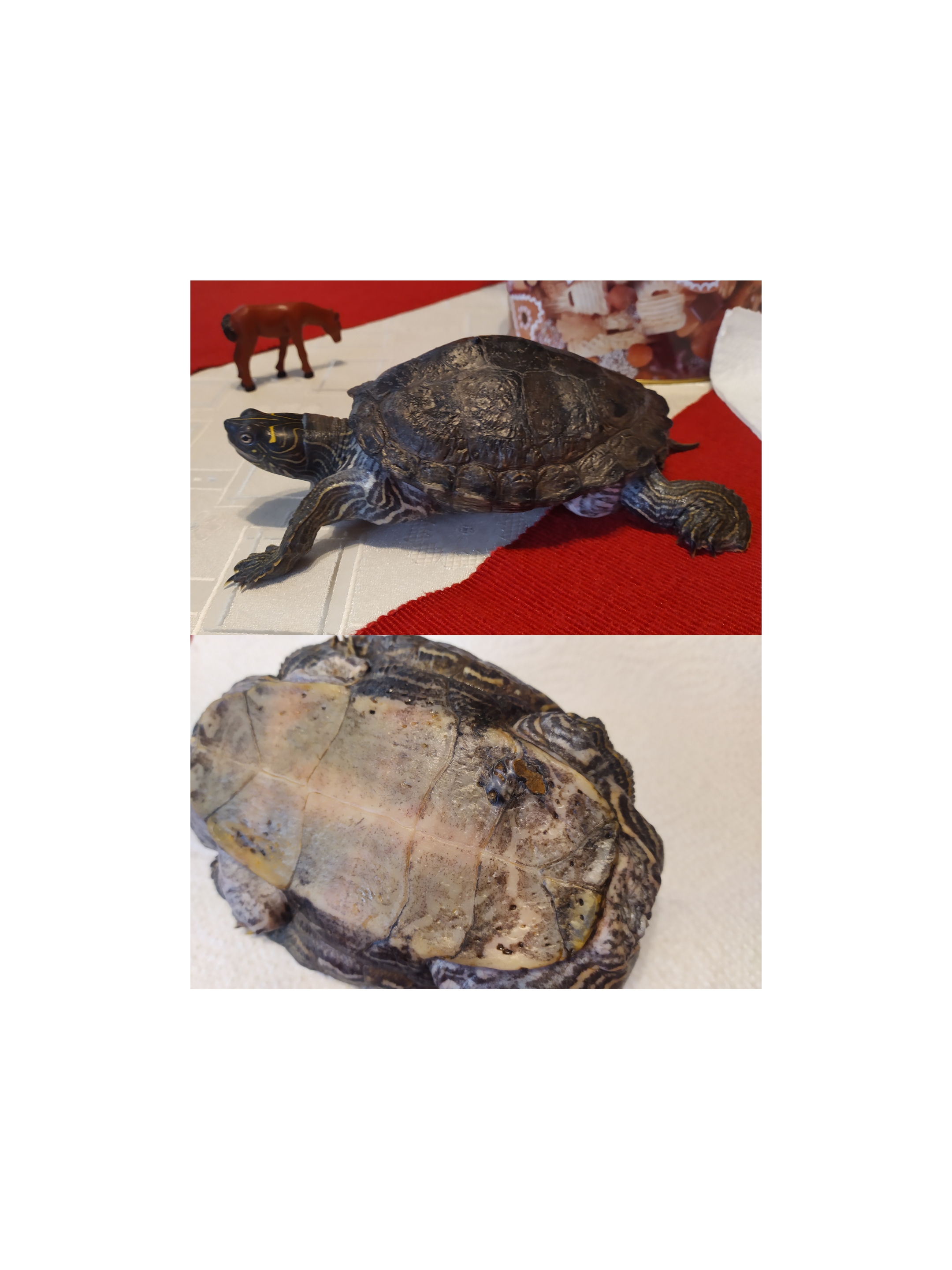 Dobrý den, našli jsme chybu v krunýři naší želvy. Je rozpoznatelné o co jde? Nemáme tu veterinu na plazy. Je někde seznam, kam se dá s želvou případně zajít? (Terárium má 40l vody, souš, na které je pod žárovkou želva často. Krmení granulky a gamarus. Želvě je téměř 30let. Jinak se chová normálně a vypadá dobře.)