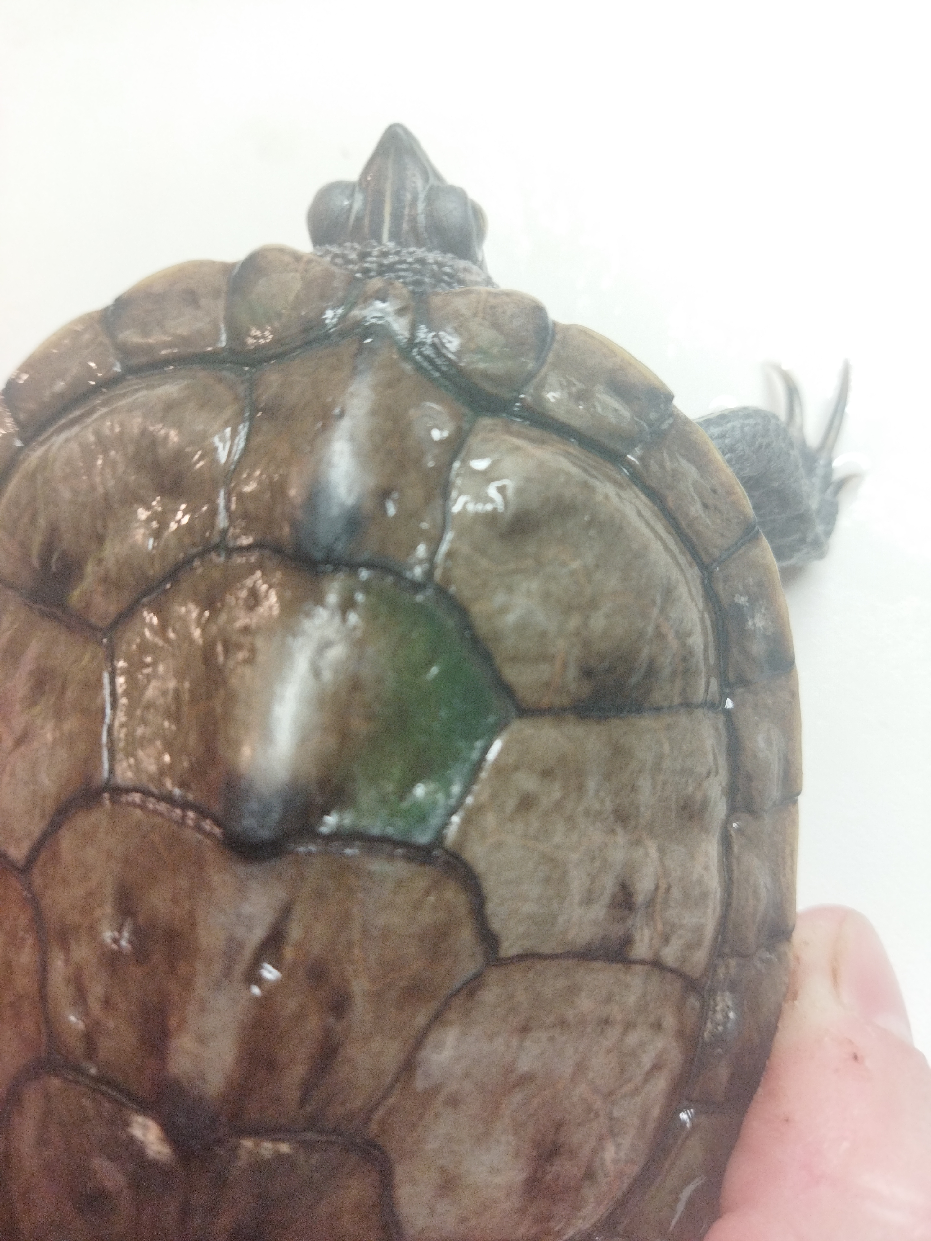 Dobrý večer, zkuste vzít jemný zubní kartáček a zelenou skvrnu s ním lehce otřít, případně použít trochu mýdla. Je dost pravděpodobné, že se jedná o porost řas na karapaxu. Hezký večer.