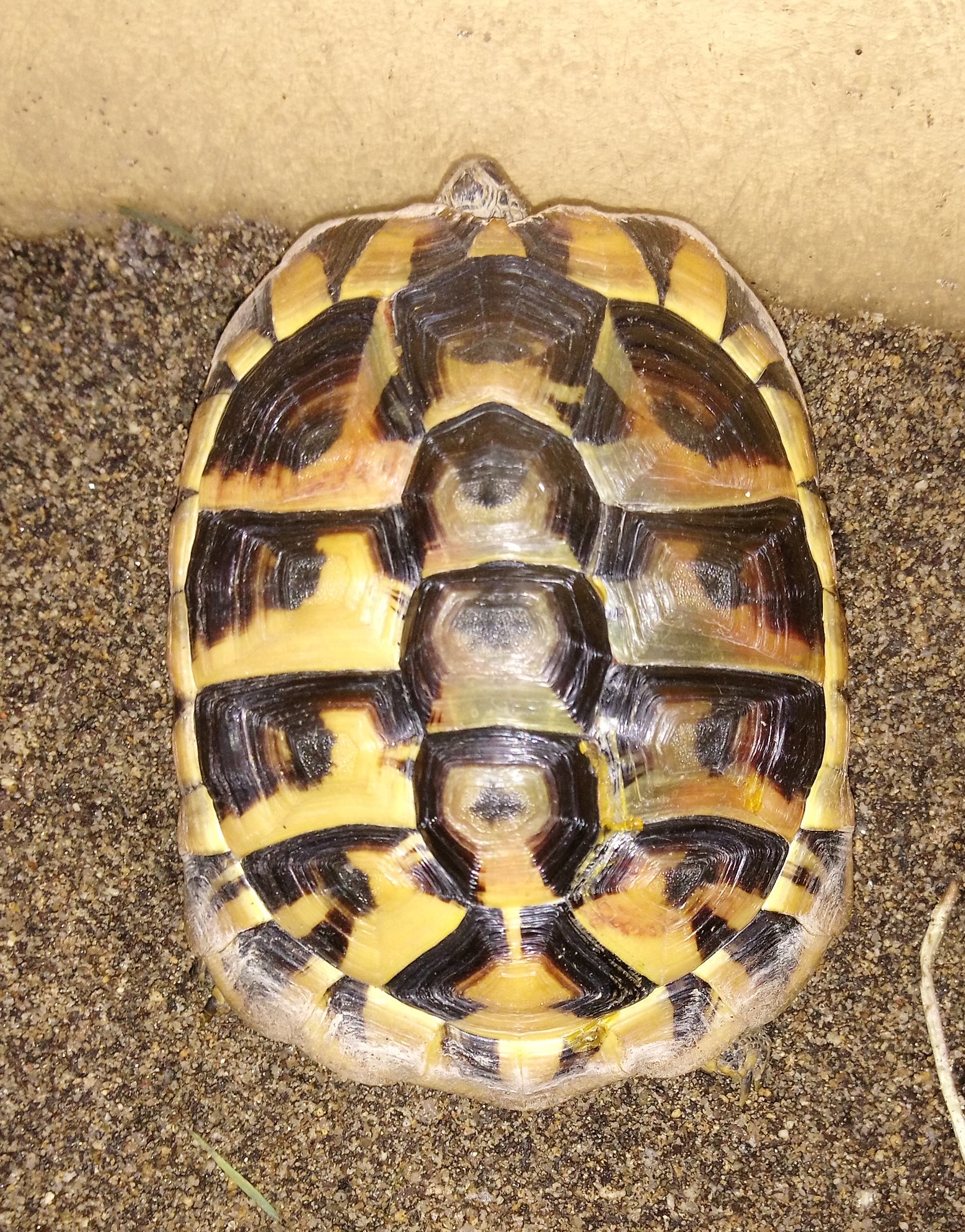 Dobrý večer, myslím, že změna barvy na krunýři byla způsobena venkovním výběhem. Pokud je celkový stav želvy v pořádku, není návštěva veterináře nutná. Hezký večer.